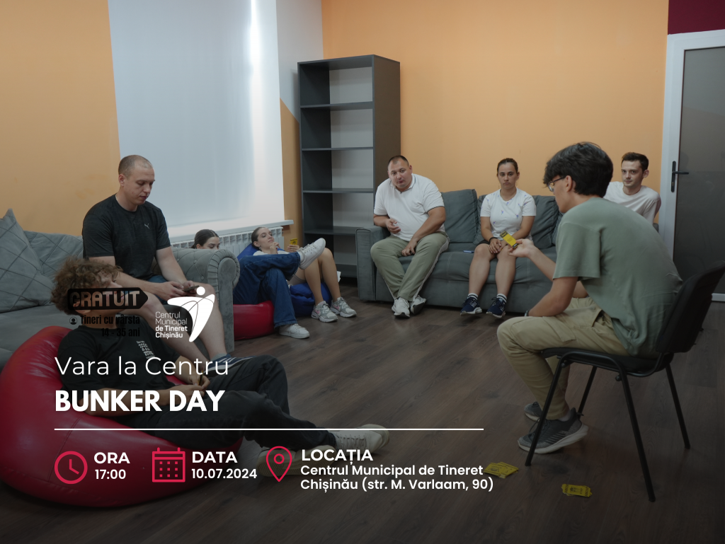 Ești gata pentru o aventură captivantă? Atunci vino mâine, 10 iulie, la ora 17:00, la Centrul Municipal de Tineret Chișinău, unde te așteaptă Bunker Day, un joc de societate interesant care te va pune în dificultate!