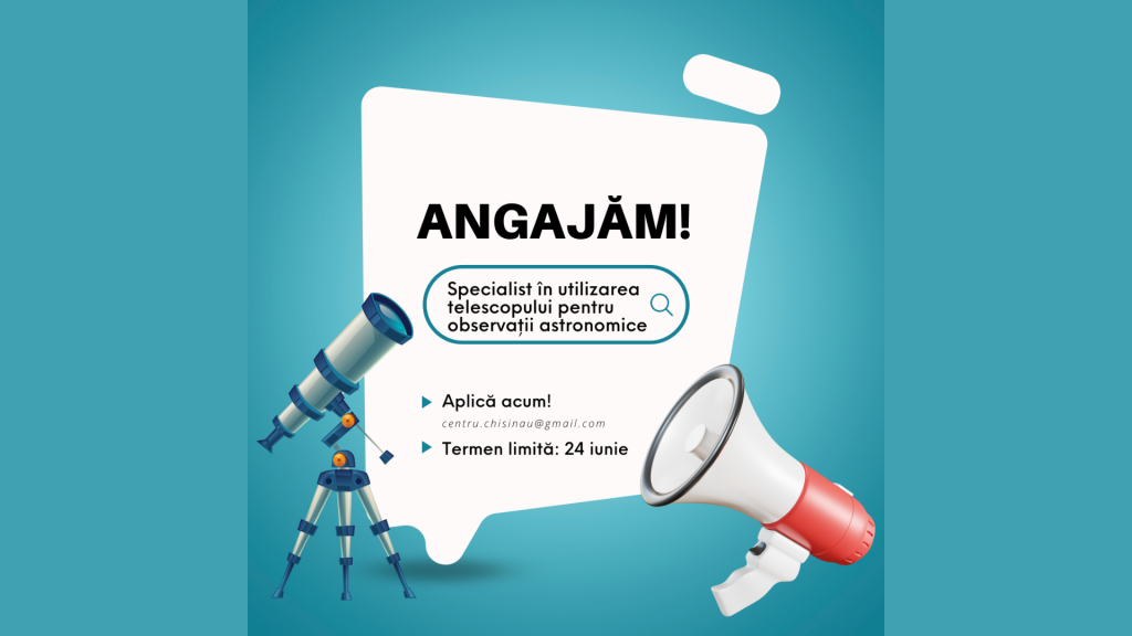 Centrul Municipal de Tineret Chișinău anunță deschiderea unei noi poziții pentru pasionații de astronomie și știință! Căutăm un Specialist în utilizarea telescopului pentru observații astronomice la Centrul de Tineret Buiucani care să se alăture echipei noastre dedicate dezvoltării și promovării cunoștințelor științifice în rândul tinerilor.