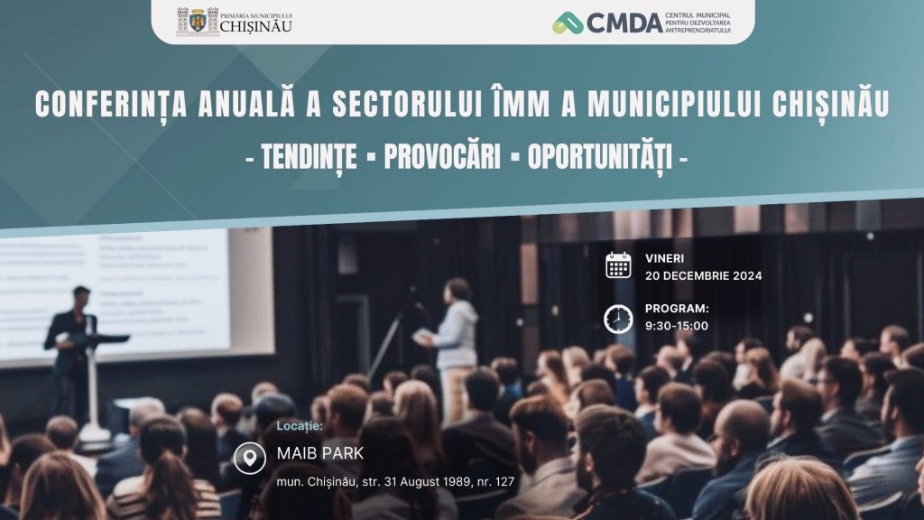 Pe 20 decembrie 2024, municipiul Chișinău va găzdui Conferința Anuală a Sectorului Întreprinderilor Mici și Mijlocii (IMM), cu tema „Tendințe, Provocări și Oportunități”. Evenimentul, organizat de Centrul Municipal pentru Dezvoltarea Antreprenoriatului, își propune să creeze o platformă de dialog între mediul de afaceri, autorități publice locale, instituții de suport antreprenorial, mediul academic și alte organizații relevante.