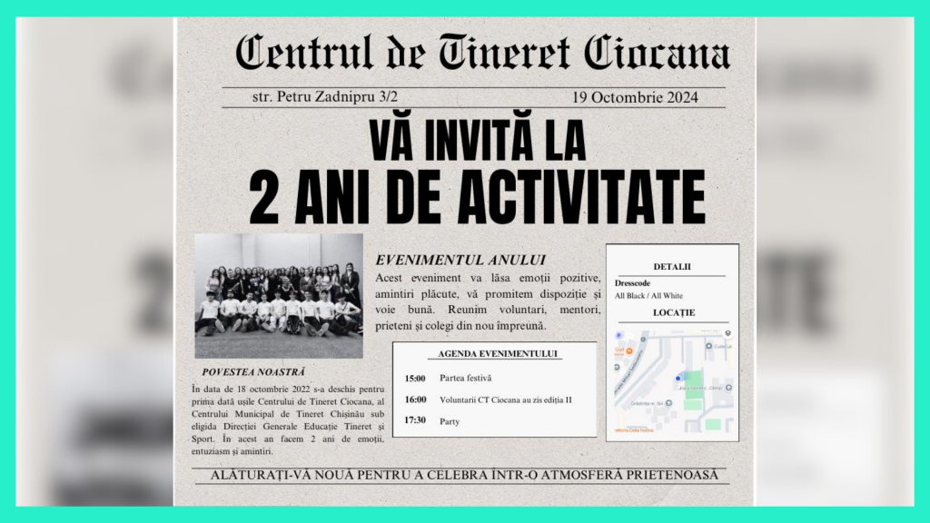 Ciocana Youth Center is celebrating 2 years of activity and invites young people from the community to participate in a special anniversary event, which will take place on October 19, starting at 15:00, on Petru Zadnipru Street 3/2.