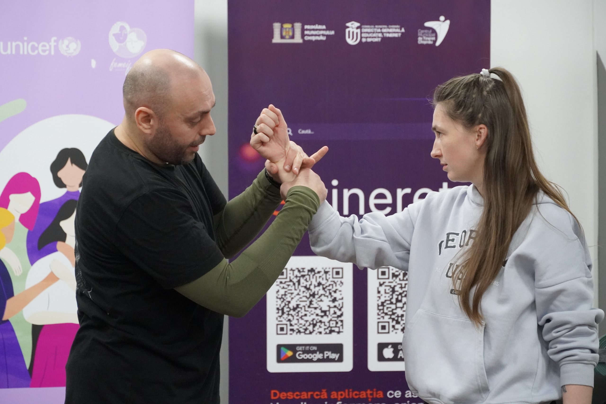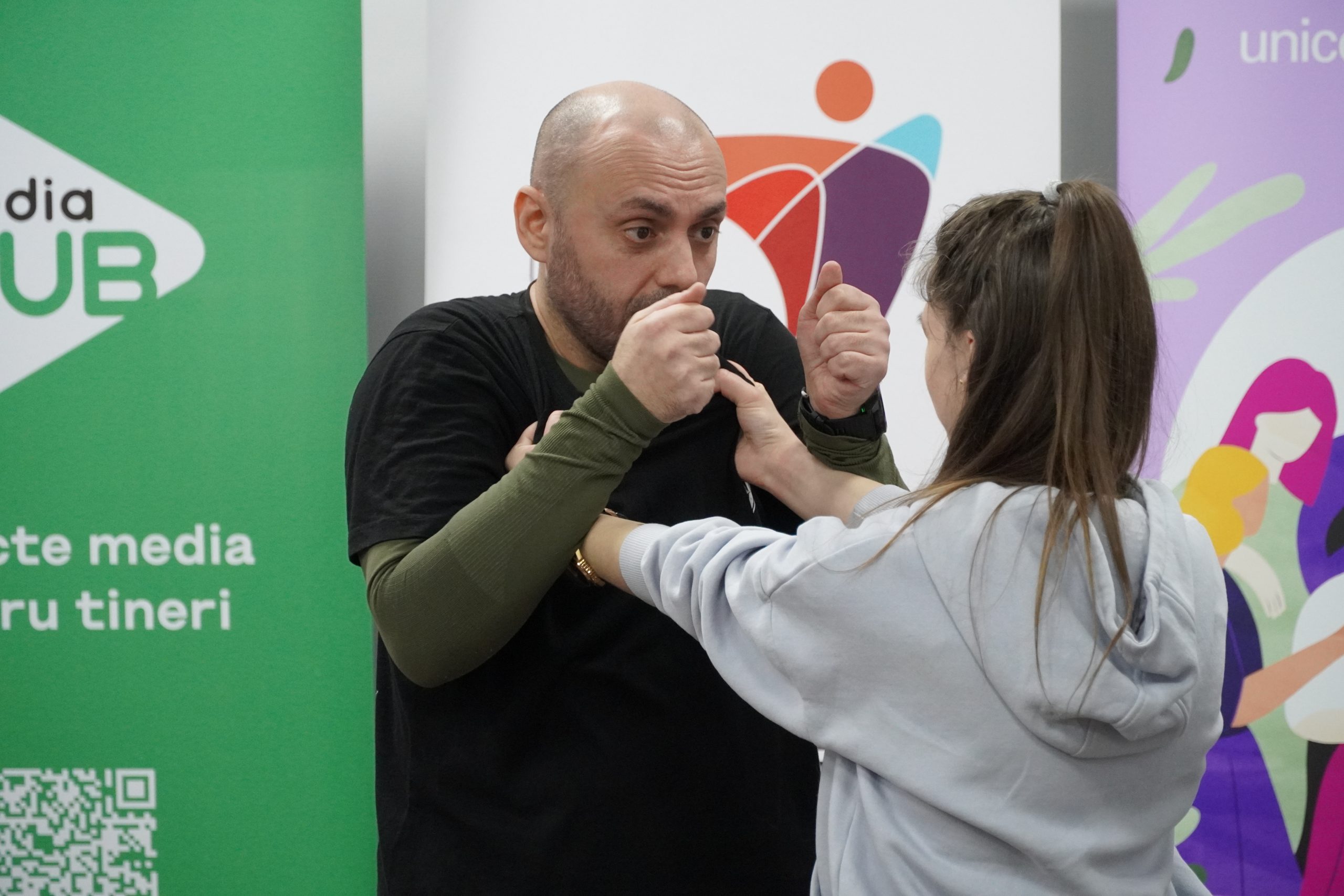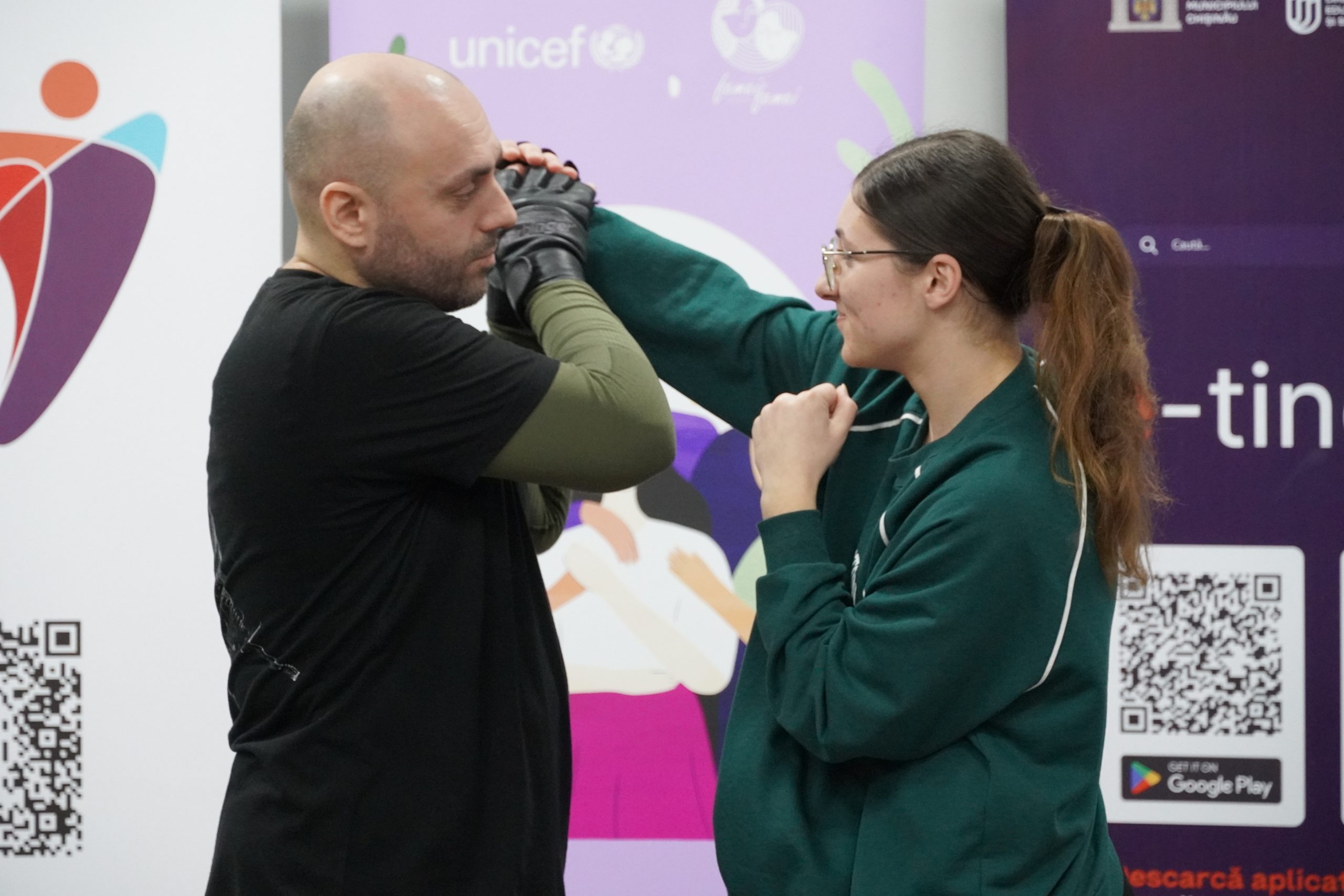 În cadrul sesiunii de autoapărare, participantele au avut oportunitatea de a învăța și de a pune în practică tehnici de bază de autoapărare, sub îndrumarea unui expert pe gestionarea situațiilor excepționale.