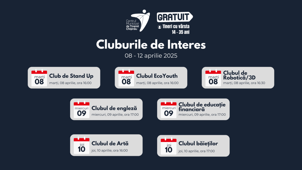 На этой неделе молодежь Кишинева также сможет насладиться разнообразной программой творческих, образовательных и интерактивных мероприятий, проводимых в клубах по интересам в Муниципальном Молодежном Центре Кишинева.